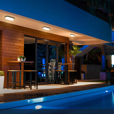 Plafoniera led rotonda adatta per montaggio a parete o soffitto in ambienti interni o esterni.